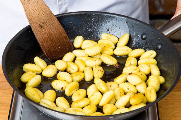 In derselben Pfanne 1EL Olivenöl mittelhoch erhitzen und die Gnocchi darin ca. 5–8Min. goldbraun anbraten. Mit Salz würzen.
