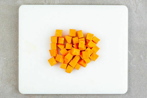 In einem großen Topf ausreichend gesalzenes Wasser für die Süßkartoffeln und die Tortelloni zum Kochen bringen. Die Süßkartoffeln schälen und in ca. 1cm große Würfel schneiden.