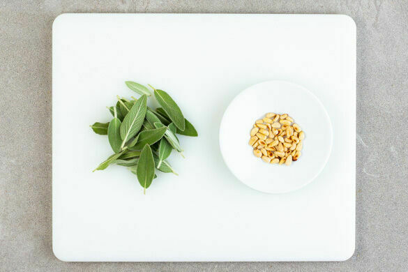 Die Pinienkerne in einer großen Pfanne ohne Zugabe von Fett bei mittlerer Hitze 1–2Min. goldbraun anrösten. Vorsicht, sie können schnell zu dunkel werden. Zum Abkühlen aus der Pfanne nehmen, die Pfanne aufbewahren. Die Salbeiblätter von den Stängeln zupfen, sehr große Blätter längs halbieren.
