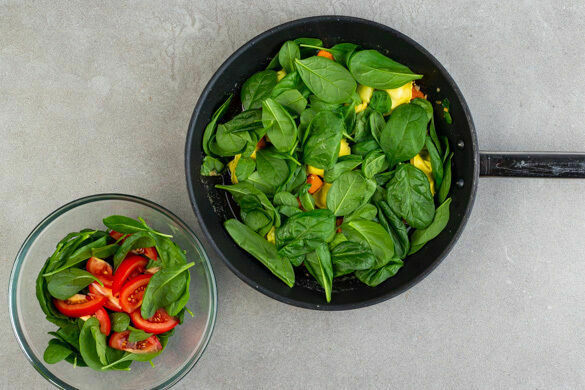Die 1/2 des Spinats unterheben und zusammenfallen lassen. Mit Salz und Pfeffer abschmecken, ggf. mit etwas Kochwasser und nach Geschmack mehr Butter cremig rühren. Den restlichen Spinat mit den Tomaten und dem Dressing vermengen. Die Tortellonipfanne mit den Pinienkernen und dem Käse garniert servieren und den Tomaten-Spinat-Salat dazu reichen.