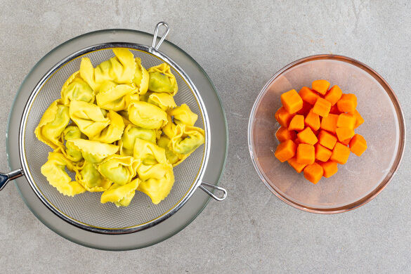 Die Süßkartoffeln in das kochende Wasser geben und bei mittlerer Hitze 2–3Min. köcheln lassen. Die Tortelloni hinzugeben und in 4–5Min. bissfest kochen. Mit einer Tasse etwas Kochwasser abschöpfen, dann alles in ein Sieb abgießen und abtropfen lassen.