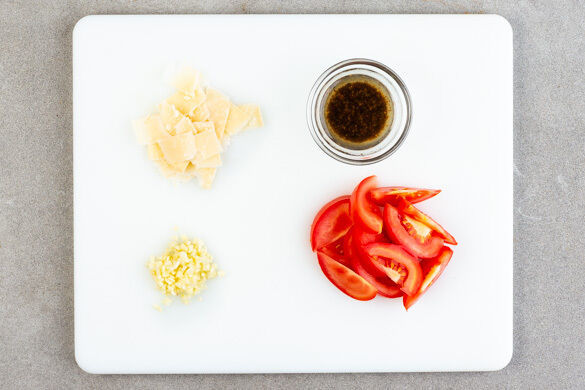 Die Tomate in schmale Spalten schneiden, den Strunk entfernen. Den Knoblauch schälen und fein würfeln. Den Käse mit einem Sparschäler in dünne Streifen hobeln. 1EL Olivenöl und 1EL Balsamicoessig mit je 1 Prise Salz, Pfeffer und Zucker zu einem Dressing verrühren.
