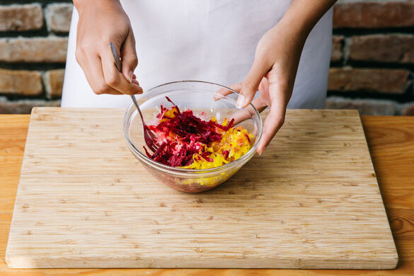 Inzwischen die Beten schälen und mit einer Küchenreibe grob raspeln. Tipp: Da Rote Bete stark färbt, beim Verarbeiten am besten Küchenhandschuhe und Schürze tragen. Mit 3–4EL Essig, 1–2TL Zucker und je 1 kräftigen Prise Salz und Pfeffer gut vermengen.