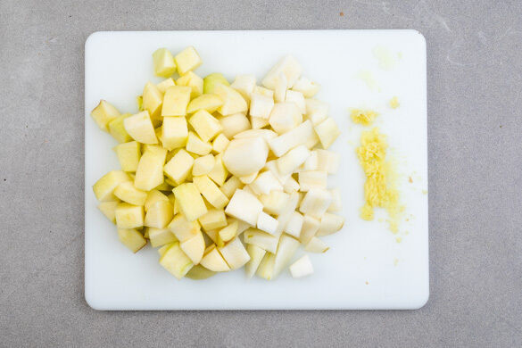 Die Birnen und die Äpfel schälen, entkernen und in ca. 1,5cm große Stücke schneiden. Den Ingwer schälen und fein reiben.