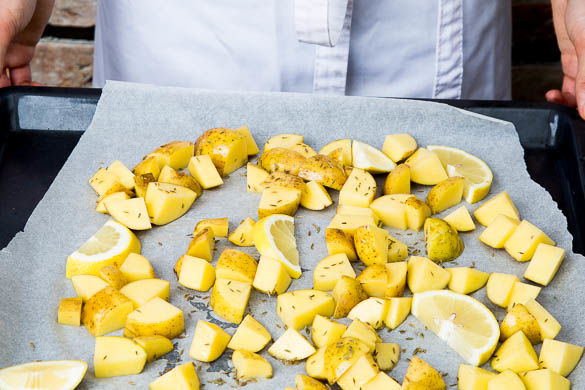 Backofen auf 200°C Umluft vorheizen. Die Kartoffeln in ca. 2cm große Stücke schneiden. Die Zitrone halbieren, eine Hälfte in Scheiben schneiden, die andere entsaften.