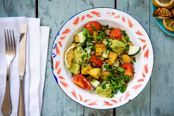 Die Kartoffeln und Tomaten vorsichtig mit der Gurke und den Kräutern vermischen und die geröstete Zitrone darüber auspressen. Mit den Sonnenblumenkernen bestreuen und zusammen mit der Guacamole servieren.