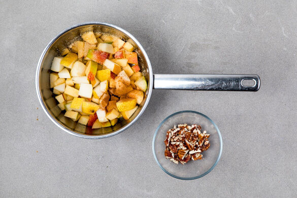 Das Obst mit 1EL Zitronensaft, 1/2TL Zimt und 1–2EL (braunem) Zucker in einen kleinen Topf geben. Ca. 150ml Wasser angießen und das Obst unter gelegentlichem Rühren bei mittlerer Hitze in 8–10Min. zu einem Kompott einkochen. Die Pekannüsse grob hacken.