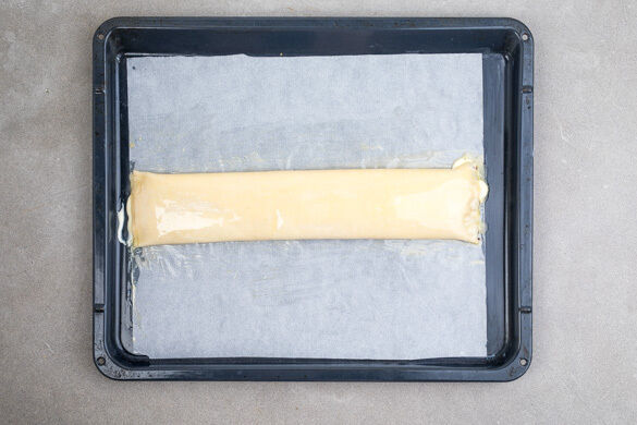 Den Strudel von der gefüllten Seite aus zusammenrollen und die Enden gut mit den Fingern zusammendrücken. Die Strudelnaht vorsichtig nach unten drehen, dann den Strudel mit dem Backpapier auf ein Backblech legen und 15–20Min. im Ofen goldbraun backen.