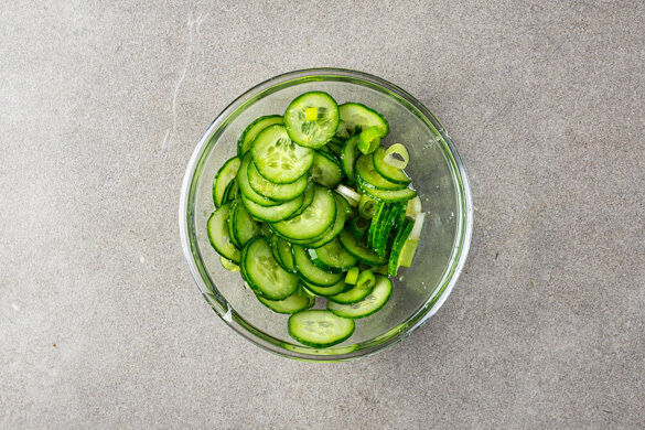 Das Toastbrot goldbraun toasten. Die Lauchzwiebel in feine Ringe schneiden. Den restlichen Reisessig mit 1–2TL (braunem) Zucker sowie je 1 Prise Salz und Pfeffer verrühren und mit den Lauchzwiebeln und den Gurken zu einem Salat vermengen.