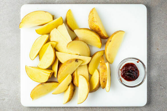 Den Ofen auf 240°C (220°C Umluft) vorheizen. Die Kartoffeln samt Schale halbieren und in Spalten schneiden. 4EL Ketchup mit der 1/2 Misopaste oder mehr nach Geschmack zu einem Dip vermengen.