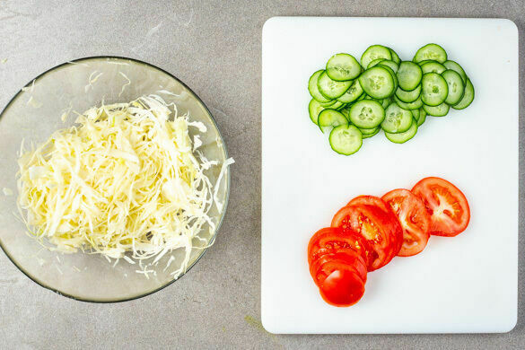 Die 1/2 des Weißkohls in feine Streifen schneiden. Der restliche Kohl wird für dieses Rezept nicht benötigt. Den Weißkohl mit 1–2EL Reisessig und 1/2TL Salz ca. 2Min. mit den Händen gut durchkneten, bis der Kohl weich ist. Die Tomaten und die Gurke in dünne Scheiben schneiden.