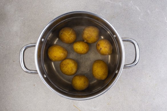 Den Backofen auf 240°C (220°C Umluft) vorheizen. In einem mittelgroßen Topf ausreichend gesalzenes Wasser für die Kartoffeln zum Kochen bringen. Die Kartoffeln samt Schale 10Min. vorkochen und anschließend in ein Sieb abgießen. Sie sollen noch nicht gar gekocht werden.