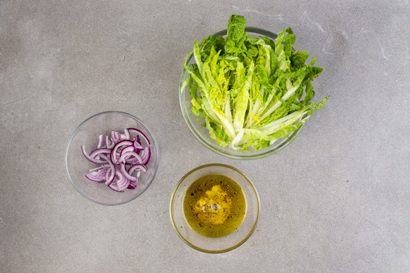 Den Salat in grobe Streifen schneiden, dabei den Strunk entfernen. Die Pilze ggf. säubern und in dünne Scheiben schneiden. Die Zwiebel schälen und halbieren, eine Hälfte fein würfeln, die andere Hälfte in feine Streifen schneiden. Den Schnittlauch in kleine Röllchen schneiden.
