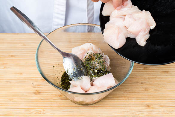 Das Fleisch mit etwas Küchenkrepp trocken tupfen, in ca. 2cm große Würfel schneiden und gut mit dem Gewürzöl vermengen. Bis zur weiteren Verwendung beiseitestellen.