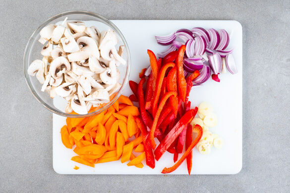 Die Paprika vierteln, entkernen und in dünne Streifen schneiden. Die Karotte ggf. schälen, längs halbieren und schräg in dünne Scheiben schneiden. Die Pilze ggf. säubern und je nach Größe vierteln oder sechsteln. Die Zwiebel schälen, halbieren und in dünne Spalten schneiden. Den Knoblauch schälen und in feine Scheibchen schneiden.