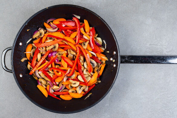 Die Paprika, die Karotten, die Pilze und die Zwiebeln in der Pfanne mit 1EL Pflanzenöl bei starker Hitze 3–4Min. anbraten. Den Knoblauch dazugeben und ca. 1Min. mitbraten.