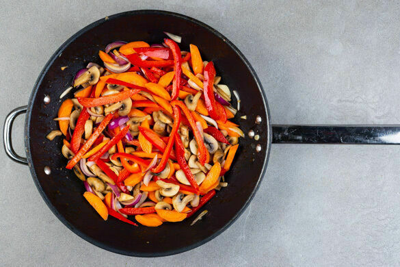 Die Paprika, die Karotten, die Pilze und die Zwiebeln in der Pfanne mit 2EL Pflanzenöl bei starker Hitze 3–4Min. anbraten. Den Knoblauch dazugeben und ca. 1Min. mitbraten.