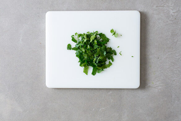 Die Korianderblätter samt Stängeln fein schneiden.