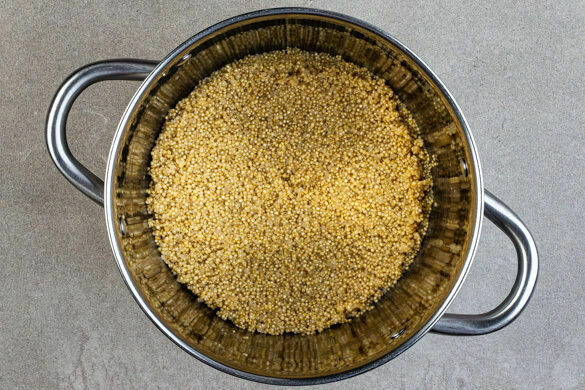 In einem mittelgroßen Topf 650ml leicht gesalzenes Wasser zum Kochen bringen. Die Quinoa in einem feinmaschigen Sieb mit warmem Wasser abspülen, in das kochende Wasser geben und 10–12Min. abgedeckt bei niedriger bis mittlerer Hitze sanft köcheln lassen. Vom Herd nehmen und bis zum Servieren warm halten.