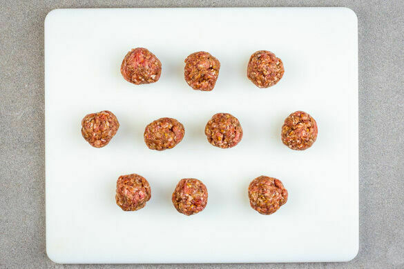 Den Knoblauch durch eine Knoblauchpresse drücken oder sehr fein würfeln und anschließend mit dem Hackfleisch, der Gewürzmischung und je 1/2TL Salz und Pfeffer verkneten. Mit angefeuchteten Händen 16–18 golfballgroße Hackbällchen formen.