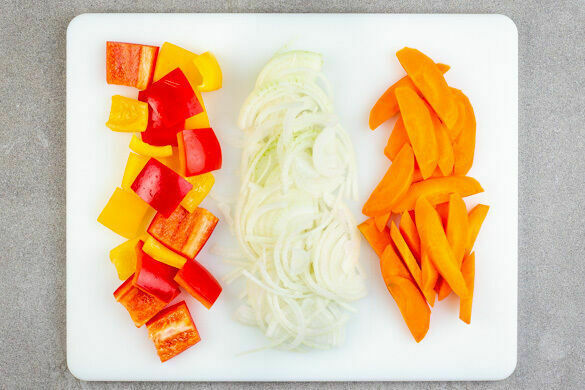 Die roten und die gelben Paprika vierteln, entkernen und in ca. 2cm große Würfel schneiden. Die Zwiebeln schälen, halbieren und in feine Streifen schneiden. Die Karotten ggf. schälen, längs halbieren und schräg in Scheiben schneiden.