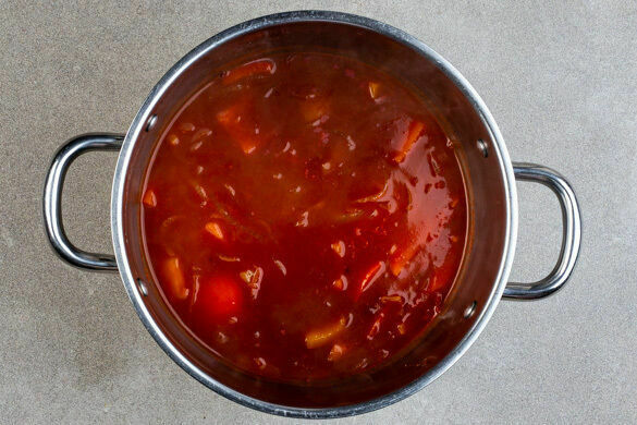 Das Gemüse in den Topf geben und mit je 1 kräftigen Prise Salz und Pfeffer bei mittlerer bis starker Hitze ca. 2Min. braten. Nach gewünschtem Schärfegrad die 1/2–3/4 der Chiliflocken, die passierten Tomaten und 800ml Wasser dazugeben, dann das Brühgewürz einrühren. Den Eintopf zum Kochen bringen und abgedeckt ca. 10Min. köcheln lassen. Mit Salz und Pfeffer abschmecken.