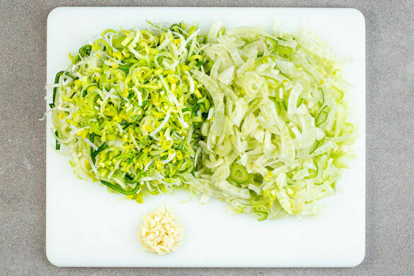 Den Lauch längs halbieren und quer in feine Streifen schneiden. Den Fenchel ebenfalls längs halbieren und in feine Streifen schneiden, dabei den Strunk entfernen. Das Fenchelgrün für die Garnitur aufbewahren. Den Knoblauch schälen und grob würfeln.