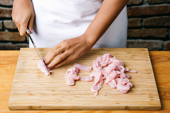 Das Fleisch trocken tupfen und jeweils der Länge nach in 3 gleich breite Streifen schneiden, diese Streifen dann quer in ca. 0,5cm dünne Scheiben schneiden. Anschließend mit 2EL Pflanzenöl und 1TL Salz vermengen.