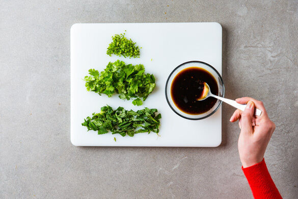 Die Minzeblätter abzupfen und grob schneiden. Die Korianderblätter von den Stängeln zupfen und grob, die Korianderstiele fein schneiden. Die Sojasauce mit der Sweet-Chili-Sauce, dem Ketjap Manis, 1EL (hellem) Essig, 2EL Wasser sowie Pfeffer zu einer Würzsauce verrühren.