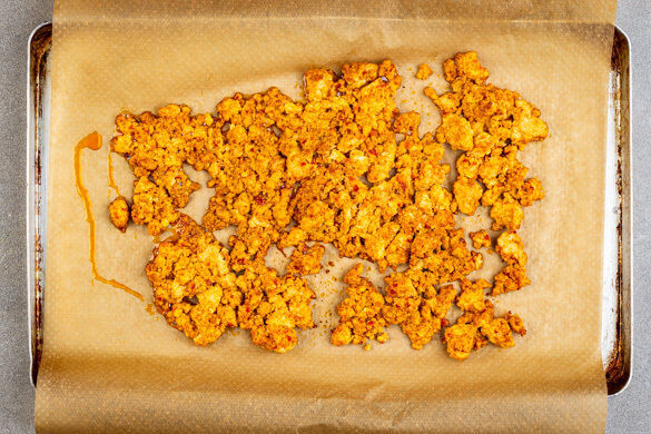Den Tofu in ein sauberes Küchentuch wickeln und möglichst viel Flüssigkeit auspressen. Anschließend den Tofu mit den Fingern zerkrümeln, mit der 1/2 der Harissa, der restlichen Sojasauce, 1EL Mehl, 1EL Pflanzenöl sowie 1 Prise Salz vermengen. Auf einem mit Backpapier ausgelegten Backblech verteilen und im mittleren Teil des Ofens in ca. 14Min. knusprig backen.