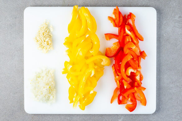 Den Backofen auf 200°C (180°C Umluft) vorheizen. Den Knoblauch schälen und grob würfeln. Die Zwiebel schälen, halbieren und fein würfeln. Die Paprika vierteln, entkernen und quer in dünne Streifen schneiden.