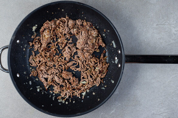 Die 1/2 des Knoblauchs und die 1/2 der Zwiebeln in einer mittelgroßen Pfanne mit 1EL Olivenöl 3–4Min. anschwitzen. Das Hackfleisch und je 1/2TL Salz und Pfeffer hinzufügen und bei mittlerer bis starker Hitze unter gelegentlichem Rühren 5–6Min. braten, bis das Hackfleisch nicht mehr rosig und ggf. austretendes Wasser vollständig verdampft ist. Die Pfanne vom Herd nehmen.