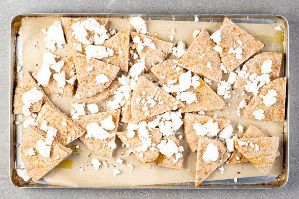 Den Backofen auf 220°C (200°C Umluft) vorheizen. Die Pitabrote aufeinanderstapeln und in 6 Dreiecke schneiden. Den Feta mit den Fingern oder einer Gabel zerkrümeln.