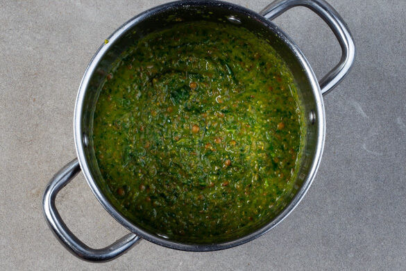 Den Koriander und den Dill samt Stängeln grob schneiden. Nach ca. 15Min. Garzeit den Spinat in den Eintopf rühren und den Eintopf abgedeckt noch 5–7Min. garen, bis die Linsen weich sind, dann den Koriander und den Dill unterrühren und den Eintopf mit einem Stabmixer nicht zu glatt pürieren. Mit 1–2EL Zitronensaft sowie Salz und Pfeffer abschmecken.
