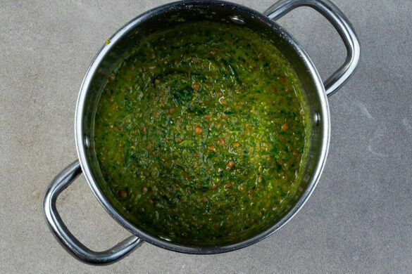 Den Koriander und den Dill samt Stängeln grob schneiden. Nach ca. 15Min. Garzeit den Spinat in den Eintopf rühren und den Eintopf abgedeckt noch 5–7Min. garen, bis die Linsen weich sind, dann den Koriander und den Dill unterrühren und den Eintopf mit einem Stabmixer nicht zu glatt pürieren. Mit 3–4EL Zitronensaft sowie Salz und Pfeffer abschmecken.