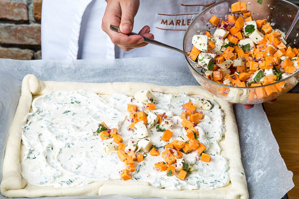 Unsere Köchin Hannah hat eine neue Pizza-Variation für dich kreiert: Mit selbstgemachtem Kräuterquark, Süßkartoffeln und Mozzarella belegt war diese Pizza ein großer Hit in unserer Testküche. Obendrauf gibt es noch frischen Grünkohl!