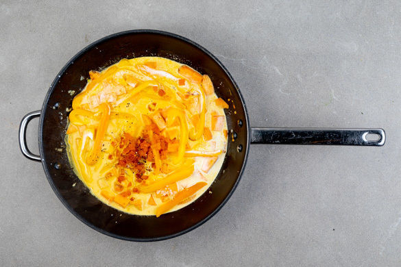 Die Aprikosen, die 1/2 der Currypaste, die Kokosmilch und 50ml Wasser zum Gemüse geben und bei niedriger Hitze weitere 10–12Min. sanft köcheln lassen, bis die Süßkartoffeln gar sind. Mit Salz und Pfeffer abschmecken und ggf. etwas mehr Wasser hinzugeben. Tipp: Wer es gerne schärfer mag, kann die ganze Currypaste verwenden.