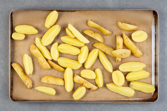 Den Backofen auf 220°C (200°C Umluft) vorheizen. Die Kartoffeln samt Schale der Länge nach in 6–8 Spalten schneiden, auf einem mit Backpapier ausgelegten Backblech verteilen und in den noch vorheizenden Ofen schieben.