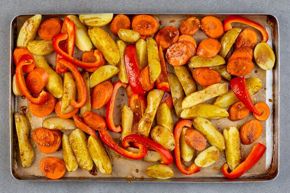Die Karotten ggf. schälen und schräg in dünne Scheiben schneiden. Die Paprika vierteln, entkernen und in 1–2cm breite Streifen schneiden. Das Gemüse auf das Backblech zu den Kartoffeln geben.