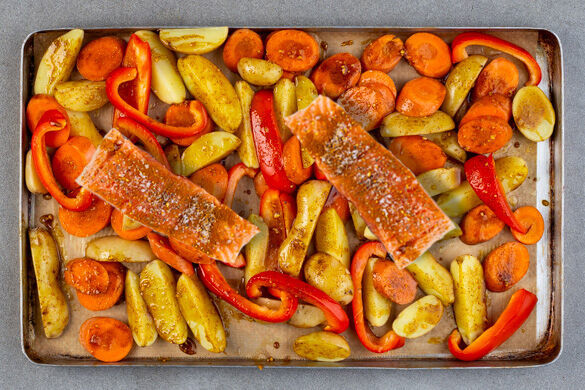 Wenn das Gemüse ca. 20Min. geröstet hat, den Fisch auf das Gemüse legen, mit 1TL Olivenöl beträufeln und 8–10Min. im Ofen mitbacken, bis der Fisch gar und das Gemüse goldbraun ist.