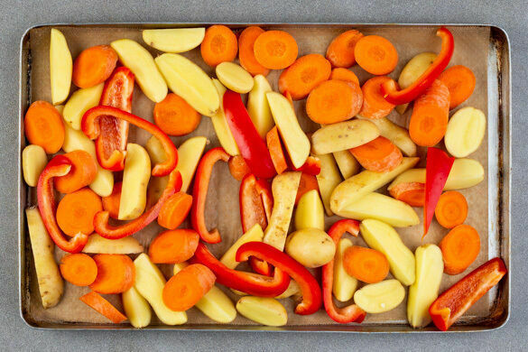 Die Karotten ggf. schälen und schräg in dünne Scheiben schneiden. Die Paprika vierteln, entkernen und in 1–2cm breite Streifen schneiden. Das Gemüse auf das Backblech zu den Kartoffeln geben. Tipp: Ggf. zwei Backbleche verwenden.