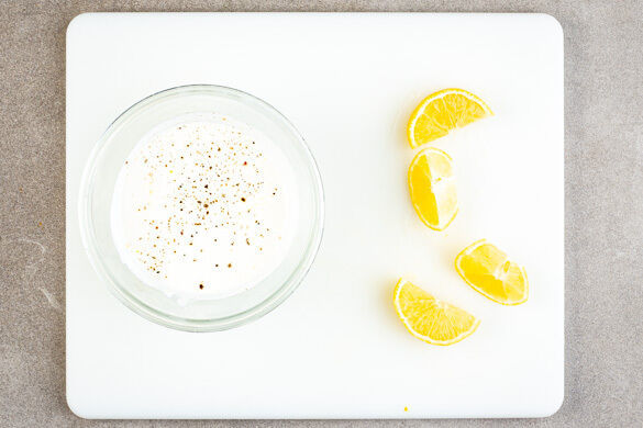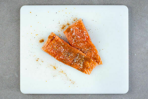 Den Fisch mit kaltem Wasser abspülen, trocken tupfen und evtl. vorhandene Gräten und Schuppen entfernen. Tipp: Wer mag, kann mit einem scharfen Messer die Haut entfernen. Den Fisch mit der restlichen Gewürzmischung einreiben und mit je 1 Prise Salz und Pfeffer würzen.