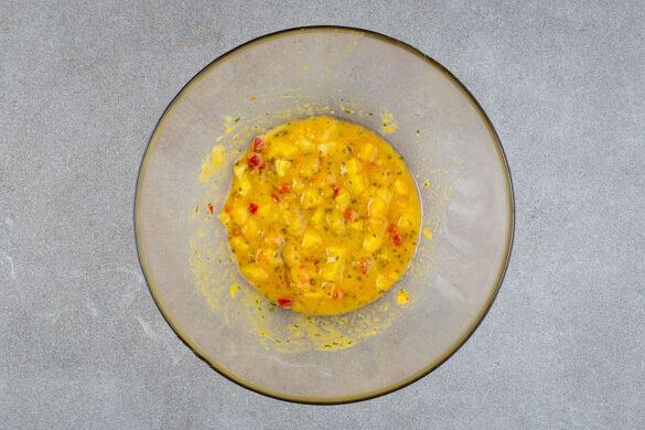 Die Mangosalsa mit 1EL Olivenöl, 2EL hellem Essig, 2TL Honig und 1/2TL Salz zu einem Dressing verrühren.