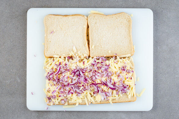 Die Zwiebel schälen, halbieren und fein würfeln. 2 Scheiben Brot mit dem Käse und den Zwiebelwürfeln belegen und mit den übrigen 2 Scheiben Brot abdecken.