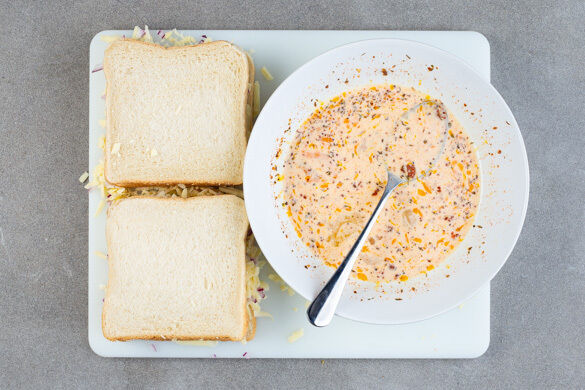 Anders als bei den Armen Rittern, die sich ja – wie der Name schon andeutet – kein frisches Brot leisten konnten, wird für diese delikate Fusion-Variation des amerikanischen French Toasts nur das frischeste Toast verwendet. Auch die Füllung ist reichhaltig: Würziger Cheddar, Zwiebeln und aromatische Cajun-Gewürze. Dazu gibt’s einen pikanten Krautsalat mit Weißkohl und Paprika mit einem Dressing aus Chili und Mangosalsa.