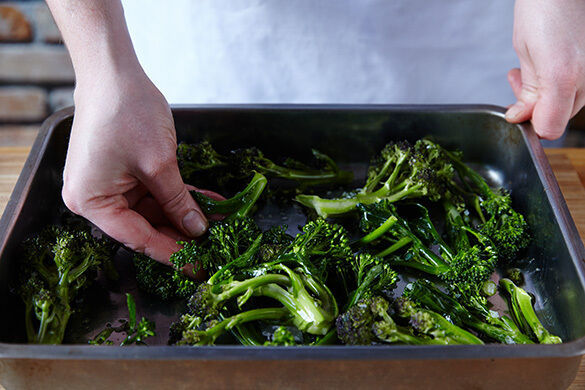 Den Brokkoli in mundgerechte Röschen schneiden, in einer weiten Auflaufform mit 1EL Olivenöl und je 1 Prise Salz und Pfeffer vermengen und 10–15Min. im Ofen rösten, bis der Brokkoli leicht gebräunt und gar ist.