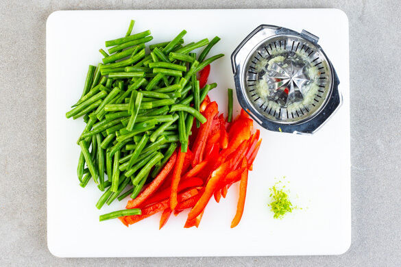 In einem kleinen Topf 400ml leicht gesalzenes Wasser für den Reis zum Kochen bringen. Die Enden der Bohnen abschneiden und die Bohnen quer halbieren. Die Paprika halbieren, entkernen und in feine Streifen schneiden. Die Limettenschale abreiben, dann die Limette halbieren und auspressen.