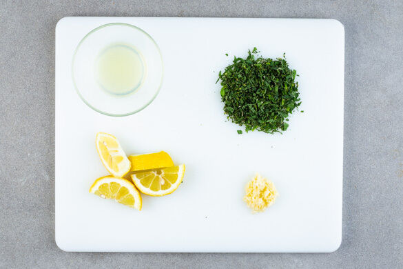 Den Backofen auf 240°C (220°C Umluft) vorheizen. Den Knoblauch schälen und fein würfeln. Die Zitrone halbieren und eine Hälfte in Spalten schneiden, die andere Hälfte auspressen. Die Minzeblätter von den Stängeln zupfen und fein schneiden.