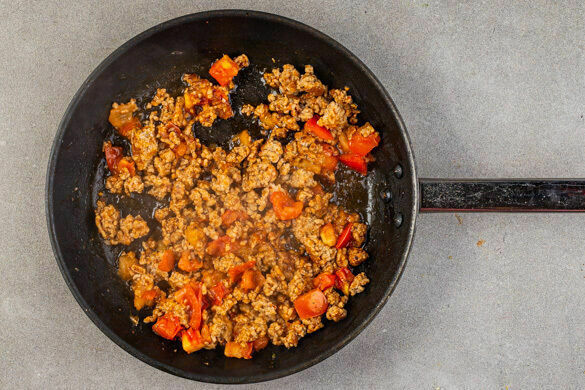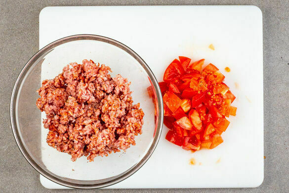 Das Hackfleisch in einer mittelgroßen Pfanne mit 1EL Olivenöl bei mittlerer bis starker Hitze ca. 2Min. anbraten und leicht zerdrücken. Wenn das Fleisch nicht mehr roh aussieht, weitere 2Min. ohne Rühren braten, damit sich eine leichte Kruste bildet. Dann etwas durchrühren und wiederum 2Min. ohne Rühren braten. Die Tomaten untermengen und mit Salz und Pfeffer abschmecken.