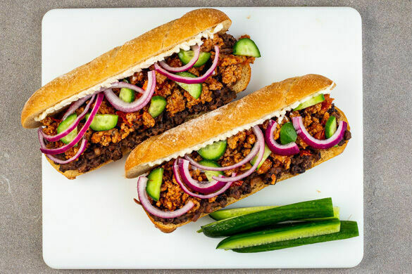 Anders als der Name suggeriert, servierst du heute keinen Kuchen, sondern mexikanisches Streetfood in Form eines wirklich robusten Sandwichs. Die Füllung besteht aus knusprigem Schweinehack, das in pikanten Gewürzen „Chorizo“-Style gebraten wird. Mit dazu schlüpfen nach Koriander duftende schwarze Bohnen, knackige Gesellschaft bekommen sie von frischen Gurkenscheiben und eingelegten Zwiebeln. Zum Anbeißen!